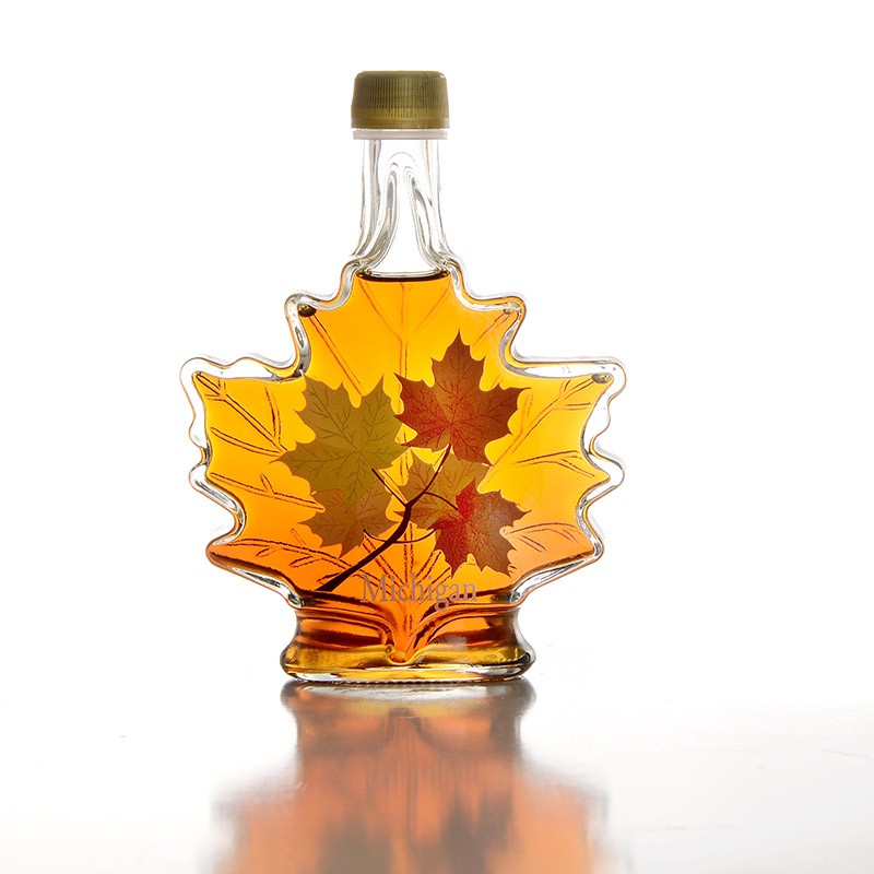 Golden Delicate Pure Maple Syrup in a leaf shaped bottle decorated with our 5 maple leaf design.