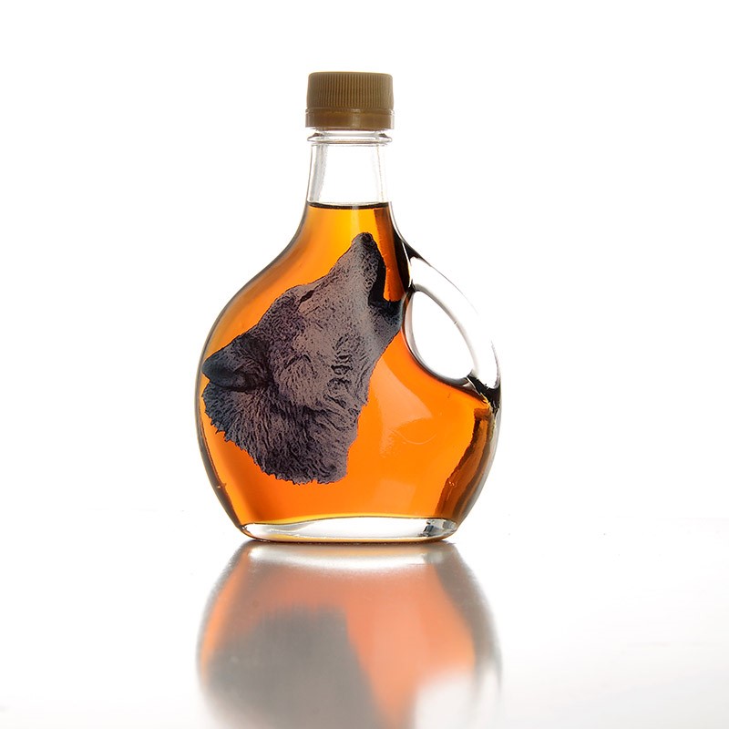 Golden Delicate Pure Maple Syrup in our most popular basque bottle featuring a howling Wolf.