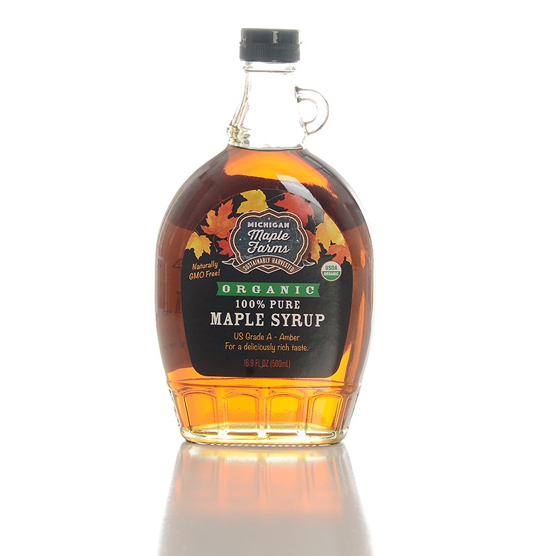 Organic Amber Rich Pure Maple Syrup in a glass flask. Not just for pancakes, replace your sugar and creamer in coffee for a sweet surprise or try it as a glaze for roasted carrots.